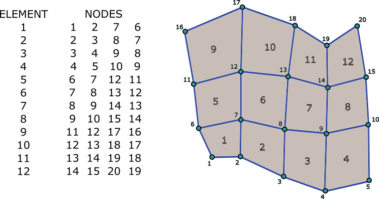 An example of a connectivity array of a 2D unstructured quadrilateral grid (source: [Thesis]).