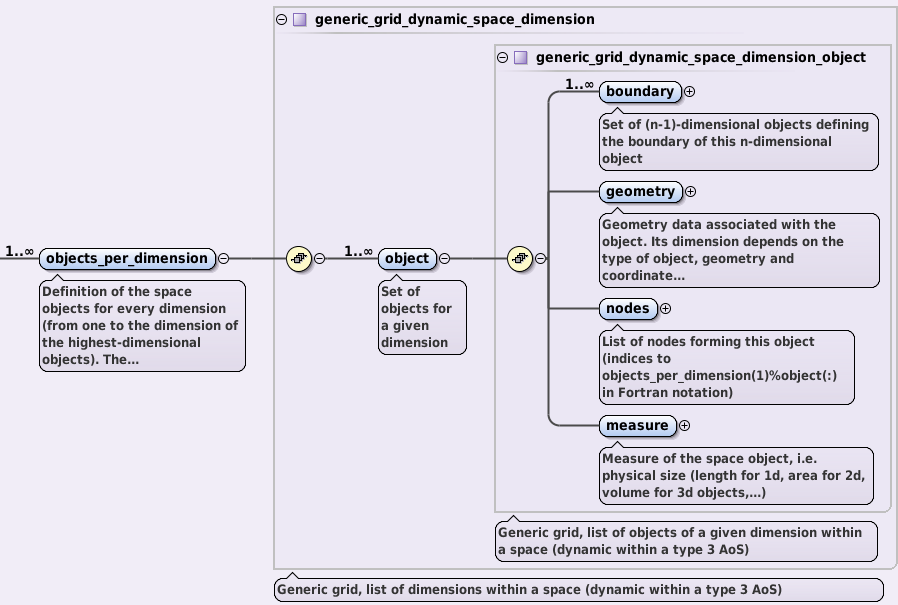 • objects_per_dimension AOS, holding definition of the space objects for every dimension. For example, objects_per_dimension(1) (note: Fortran notation, index starting with 1) holds the description on the 0D objects - points/nodes/vertices; objects_per_dimension(2) holds the description on 1D objects - lines/edges, objects_per_dimension(3) holds the description on 2D objects - surfaces, objects_per_dimension(4) holds information on 3D objects - volumes, etc.